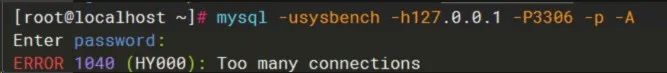 验证测试结果。在使用正常账号访问数据库时,返回结果显示已达到最大连接数限制。