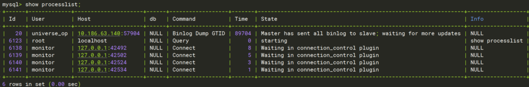 结果中可以看到 monitor 无效用户占用着连接,且 monitor 用户身份验证处于 waiting in connection_control plugin 的连接延迟状态。