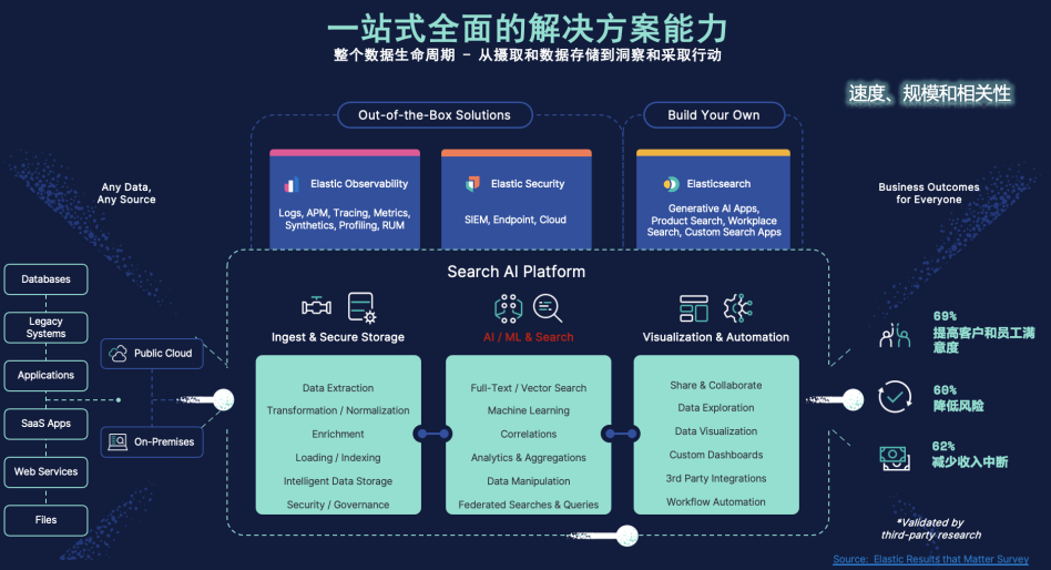 Elastic 通过一个平台,两个开箱即用的解决方案,以及构建任何内容的自由。结合搜索和 AI 的强大功能,使世界领先的企业能够更快地从中获得洞察和结果。Elastic 覆盖了所有全观测性和安全性场景。从日志到指标,再到 APM 到 SIEM,再到端点保护和云安全。覆盖整个数据的生命周期 - 从摄取和数据存储到呈现洞察和采取行动。