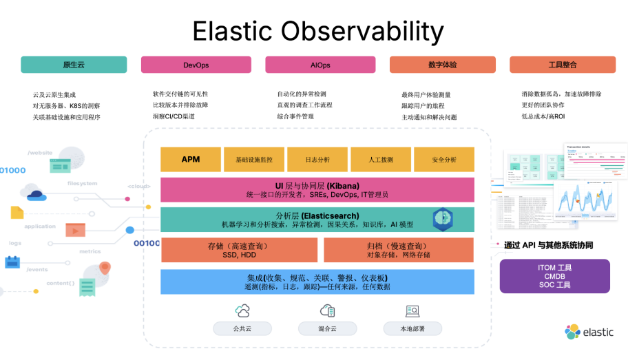Elastic 的目标就是通过构建一套集中式的全观测平台,助力去实现从传统 ITOM,到 ITOA,最终到 AIOps 的迭代进化。
