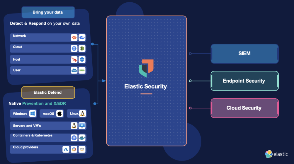 通过集成主机、网络、云、用户以及 Elastic Defend 原生支持的系统(windows、Linux、macOS)、Server、VMs、Containers、Kubernetes、Cloud providers,Elastic Securitty 可以通过机器学习和 AI助 手实现 SIEM、EDR 及 Cloud Native Security 集成安全解决方案。