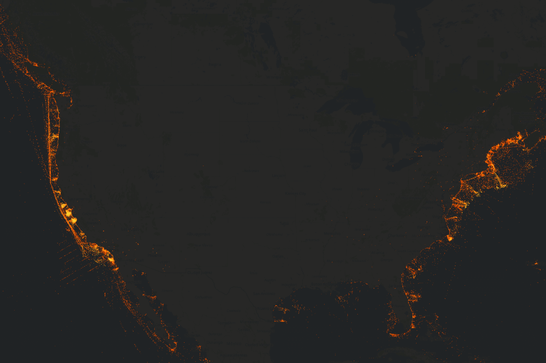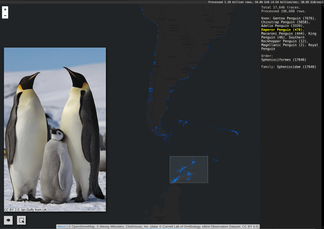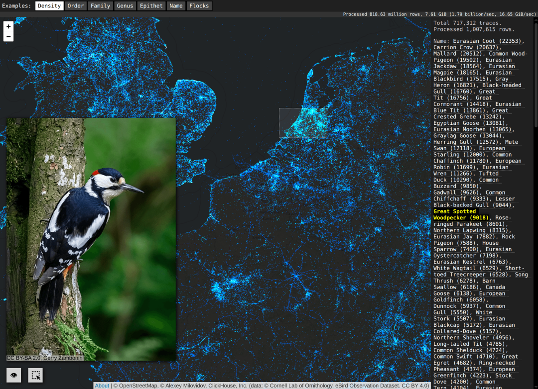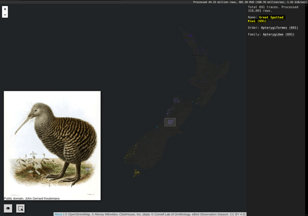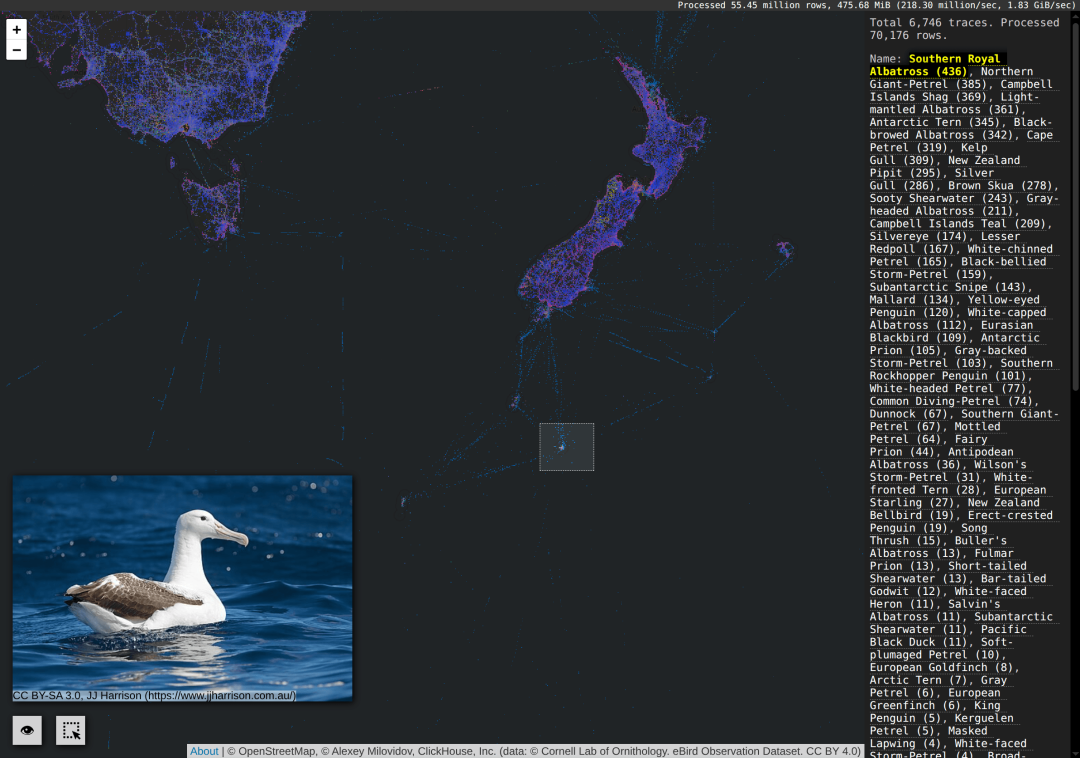 我马上把这个数据集导入了自己的可视化工具中。其实,adsb.exposed 网站已经托管了一个包含超过 1300 亿条记录的航空交通数据集,以及一个 Foursquare 地点信息的数据集。虽然天上的鸟可能比飞机多,但这个鸟类观察数据集的体量仅为航空数据的百分之一,因此非常容易加载和分析。