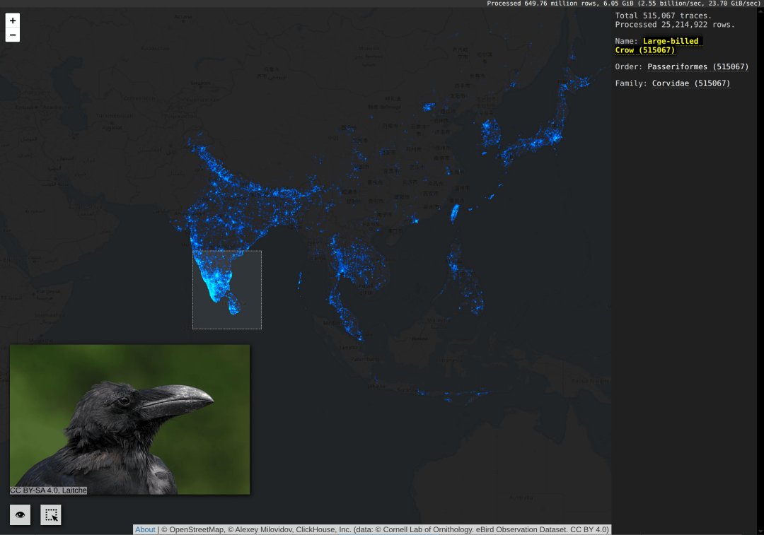 eBird 本身提供了地图可视化功能【https://secure.birds.cornell.edu/cassso/login?service=https%3A%2F%2Febird.org%2Flogin%2Fcas%3Fportal%3Debird&locale=zh_CN】,但交互性较弱,无法深入分析数据,也不支持直接运行 SQL 查询。
