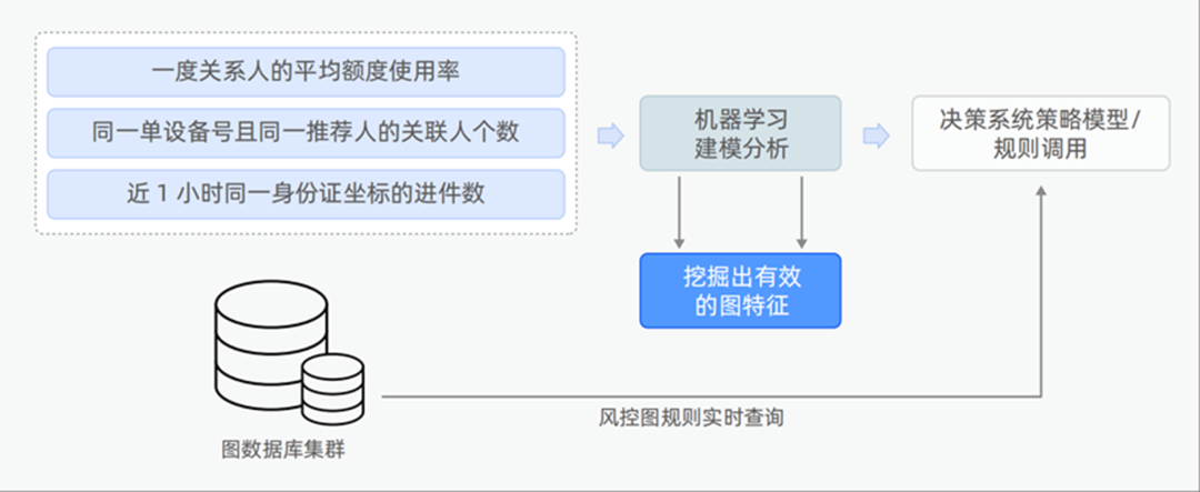 例如在授信阶段,当用户提交贷款申请后,风控引擎立即启动悦数图数据库进行实时查询,探索 1 至 3 度的关联网络。例如,系统会检查当前用户的紧急联系人是否有被列入黑名单的情况,或是确认同一设备是否与超过 5 个不同的身份证相关联。而在放款阶段,进一步利用悦数图数据库实时生成的图特征,如社区风险密度和资金流转路径等,结合机器学习模型来识别可能存在的团伙欺诈行为。