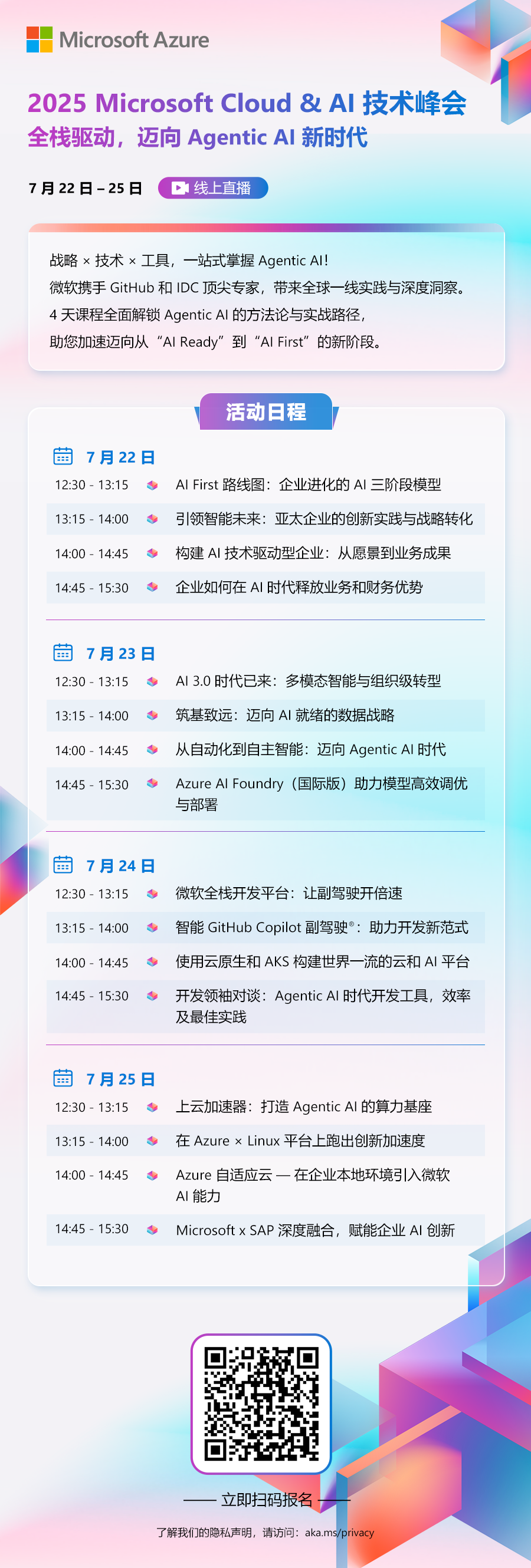 在即将揭幕的 2025 Microsoft Cloud & AI 技术峰会中,微软全球及本土顶尖专家将联袂揭示 Agentic AI 新时代的奥秘。