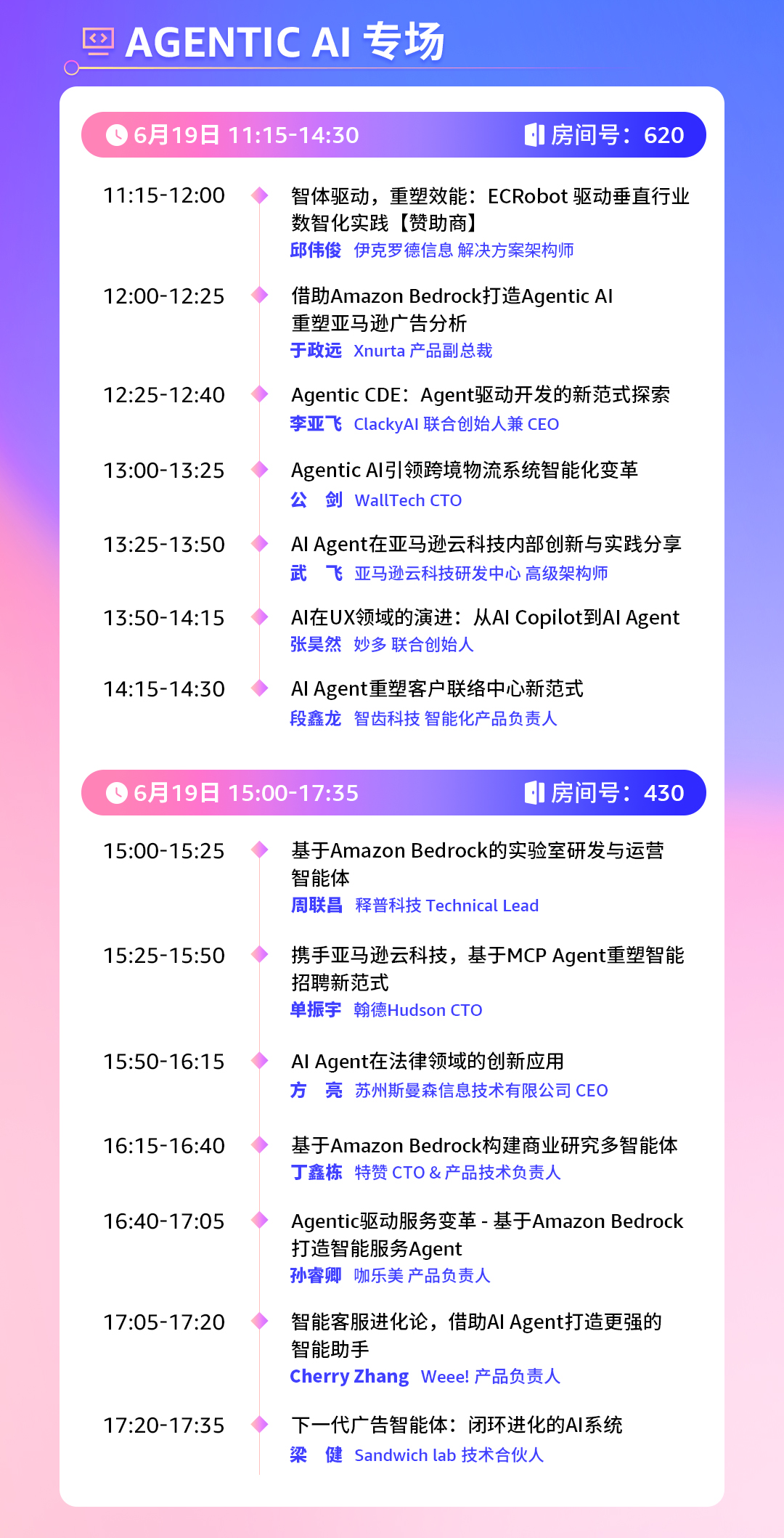 本次技术论坛邀请到多个行业的亚马逊云科技客户,分享AI Agent在智慧金融、智慧零售、智能制造、创意设计、智慧物流、智慧法务等方向的众多落地实践,展示Agentic AI的无限可能!