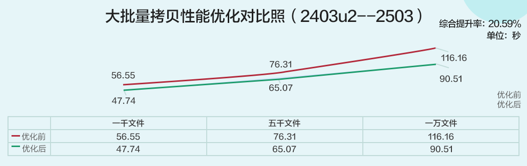 2503对大批量文件拷贝的速度做了优化提升,针对万级小文件拷贝场景,传输效率较2403版本提速20%,减少用户等待时间。