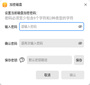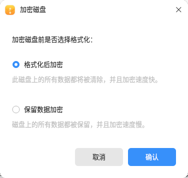 在选中对应的分区(本地分区或者U盘等外接设备)后,右键会有加密磁盘选项,点击后可以开始对分区进行加密操作,需要注意的是,格式化加密比较快,但是会擦除原来的分区数据;保留数据加密方式,加密速度较慢,需要耐心等待。