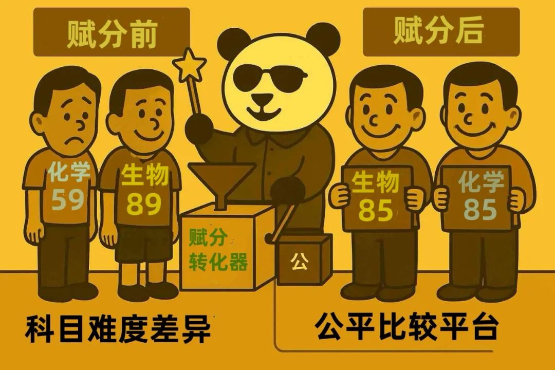 "好问题!"熊猫老师点点头,"因为物理和历史是首选科目,每个学生必须二选一,它们被认为具有较强的区分度,所以直接使用原始分。