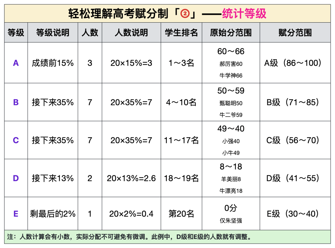 于是,20个学生的等级分就出来了。现在,让我们按照赋分制的规则来给这20名同学分配等级和赋分,如图所示。
