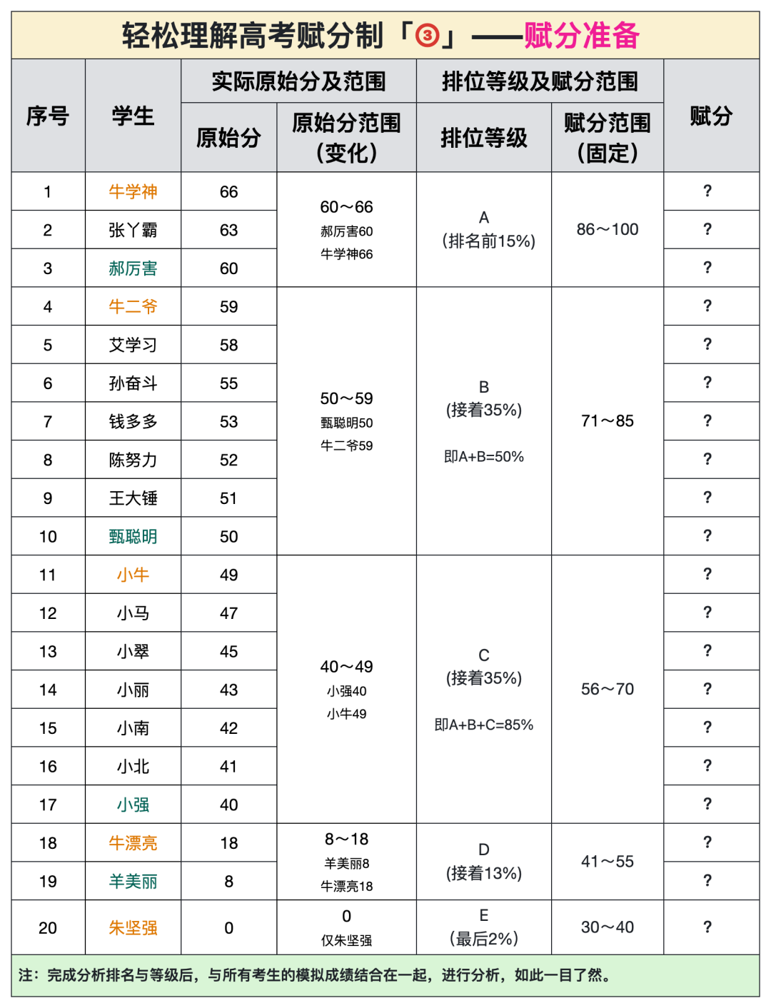 "嗯,让我们按照赋分制的规则来给这20名同学赋分,就没那么惨了。"熊猫老师在黑板上划了一条线。首先是按比例划分等级,全部20名同学按照之前说的比例划分,结果是: