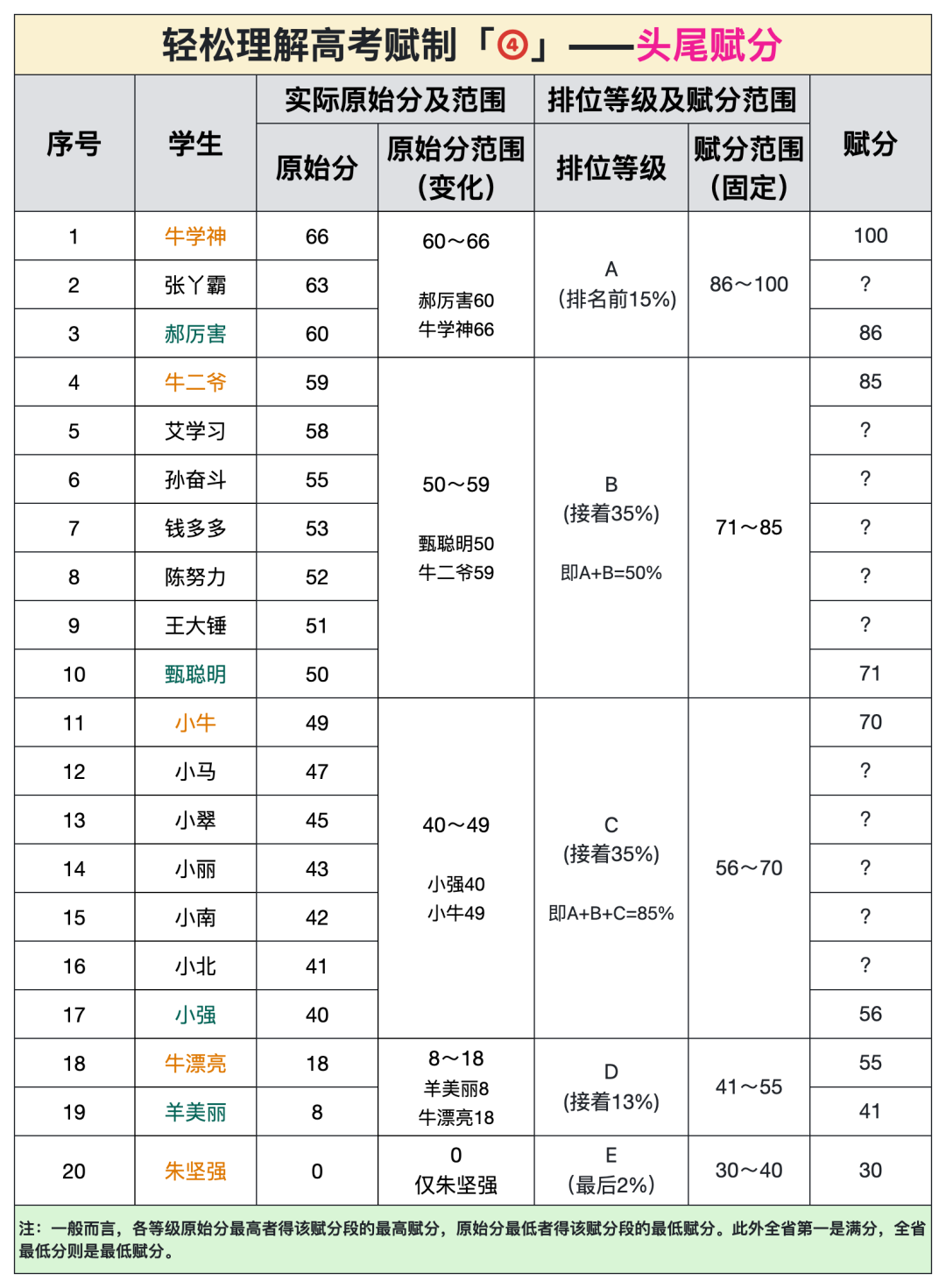小明:"哇,100分都出现了,这下不惨了!不过,这些不处在头尾,而是位于中间的同学,如张丫霸,艾学习等,他们的赋分又该如何计算呢?