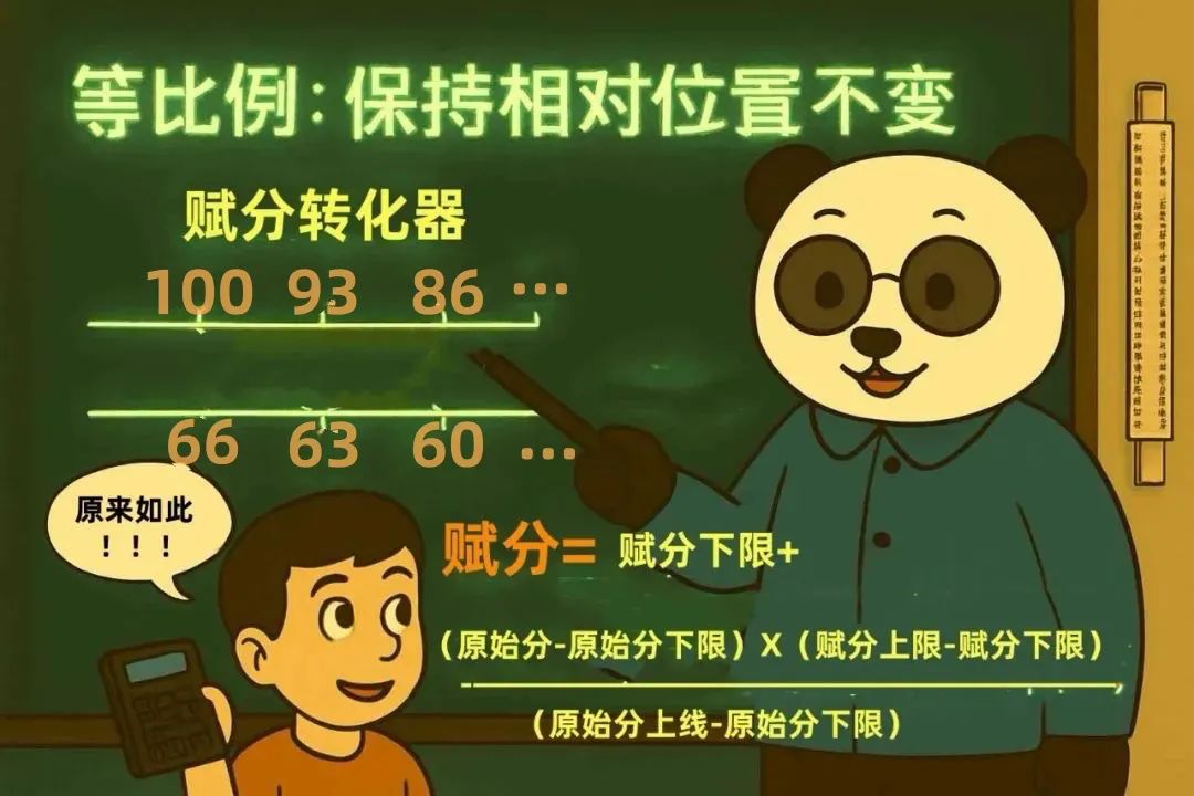 "小林牛啊!"熊猫表扬道,"是的,赋分制的核心即等比例转换,保证了不同难度科目可比,同时保留了同学们之间的实力差距。接下来,大家一起算算其他同学的赋分吧。"