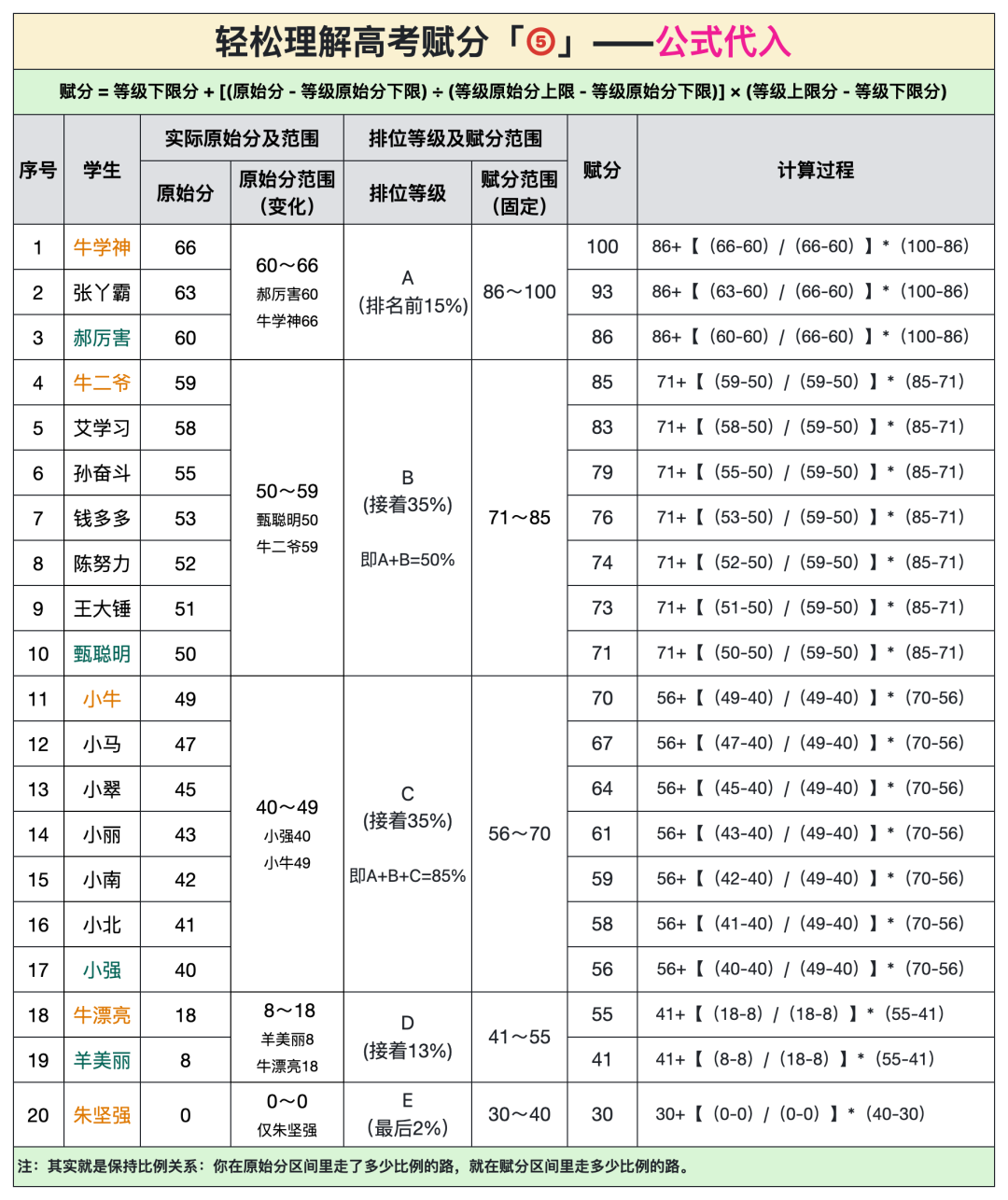 熊猫老师:“其实就是把考生在原始分中的排位,平移到赋分的分数段中。用一个公式来表达这个转换过程:赋分 = 等级下限分 + [(原始分 - 等级原始分下限) ÷ (等级原始分上限 - 等级原始分下限)] × (等级上限分 - 等级下限分)“