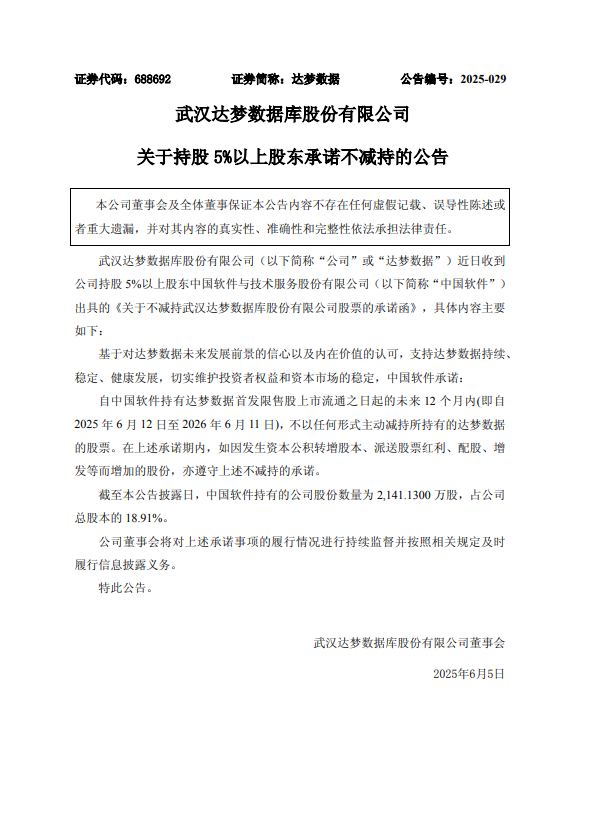 武汉达梦数据库股份有限公司(以下简称“公司”或“达梦数据”)近日收到公司持股5%以上股东中国软件与技术服务股份有限公司(以下简称“中国软件”)出具的《关于不减持武汉达梦数据库股份有限公司股票的承诺函》,具体内容主要如下: