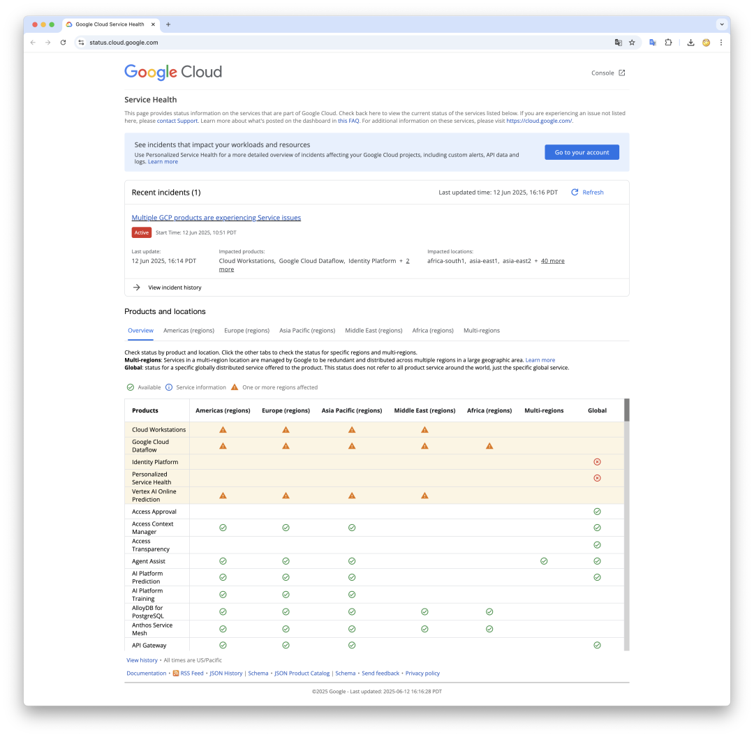 事故发生后不久,Google状态页直接提示“多项GCP产品因IAM服务问题而受到影响。这一点也在后续各种迹象中得到印证:许多用户报告调用GCP API时出现诸如“visibility check failed”(可见性检查失败)或“cannot load policy”(无法加载策略)之类的错误。这些错误信息表明,请求被阻断在权限/策略验证的环节,即云请求在到达目标服务前就因为权限或策略检查无法通过而失败。因此,可以推断根因在于Google Cloud内部的全局权限控制/策略服务出现异常。