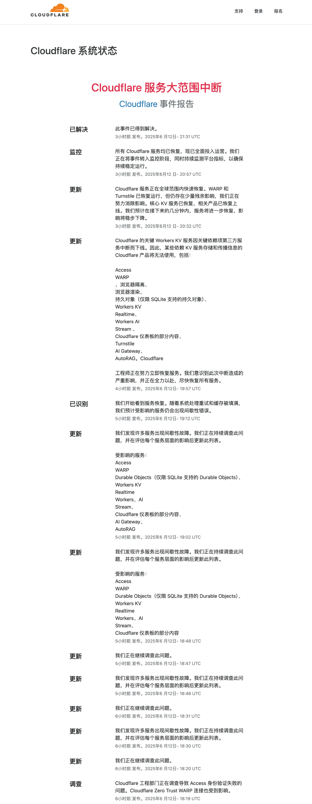 GCP 的故障影响到 Cloudflare 的关键服务,进一步导致承载了全球互联网 20% 的流量的云平台 Cloudflare 出现故障。CF 故障进一步将故障放大到互联网的各个角落。包括 Cursor,Claude,Spotify,Discord,Snapchat,Supabase 等诸多知名应用与服务都收到影响。