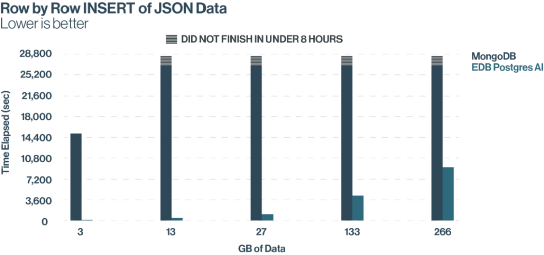 对于逐行 INSERT,EDB 比 MongoDB 快 150 倍以上。