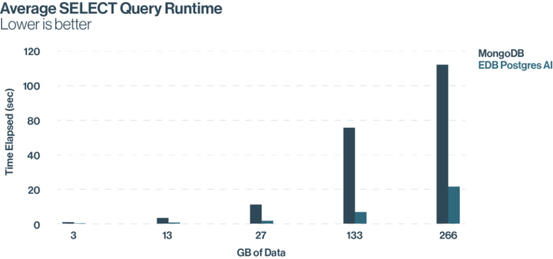 对于平均 SELECT 查询时间,EDB 比 MongoDB 快 5 倍以上。
