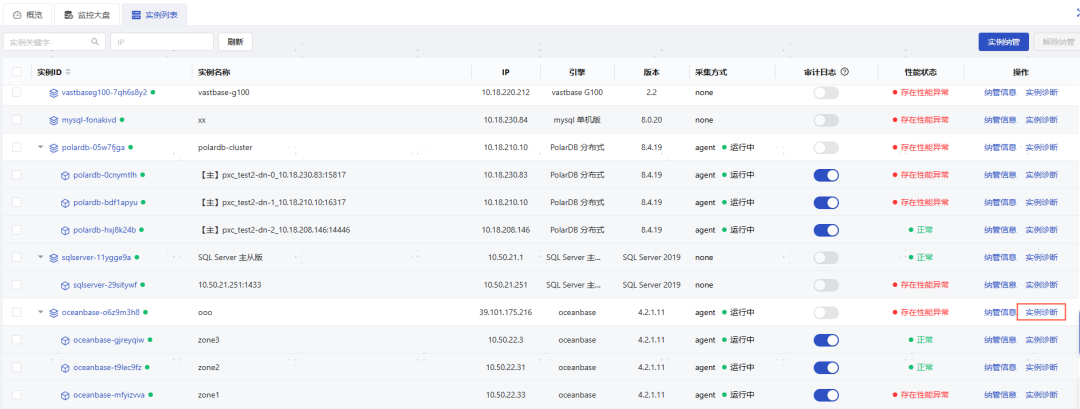 在实例管理界面,选择需要诊断的实例,即可总览该实例的运行状态。