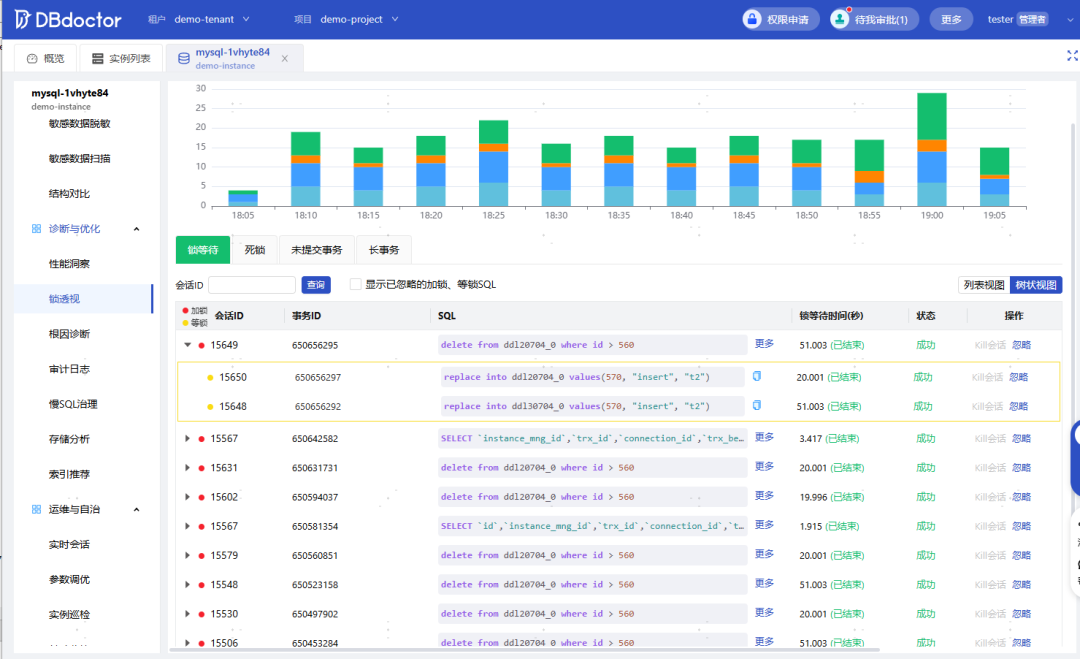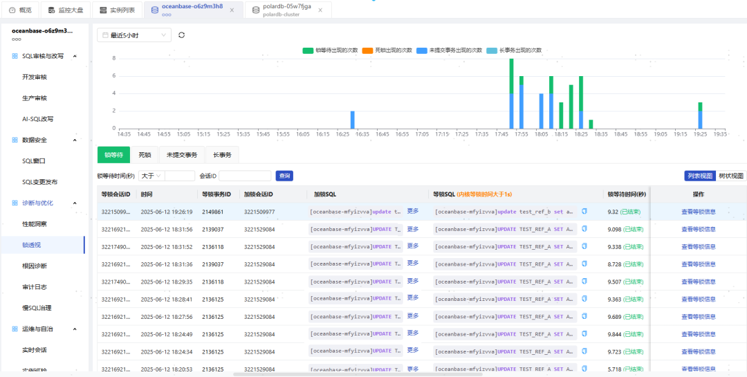 在实例诊断界面,点击左侧的“锁透视”功能栏。在这里,DBdoctor会列出当前集群中所有正在发生的锁等待、死锁、长事务等关键问题,并明确标识出每一个等待事件涉及的事务ID和所在的数据节点信息。