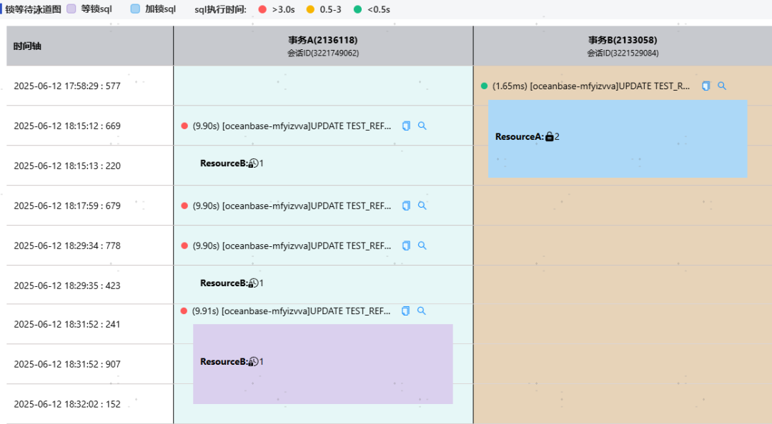 点击查看等锁信息,可以通过泳道图完整还原分布式数据库场景下的多个事务并发执行锁形成过程。从下图中能看到事务B在一个数据分片节点上加锁,事务A存在多次等锁重试(还原分布式数据库内部运行机制)。