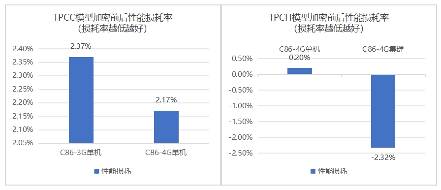 本次虚谷数据库融合海光HCT技术,在单机及分布式场景下,对海光C86-3G、C86-4G平台进行了算法函数、安全加密业务和极限高压等多项测试。基于海光密码协处理器硬件加速能力,虚谷数据库加解密性能损耗在模拟业务场景测试下仅在2.5%以下,用户无感知。同时,虚谷数据库研发了多线程存储加密特性,优化了多个相关SQL函数功能,完成了多种接口下国密算法函数的性能优化。