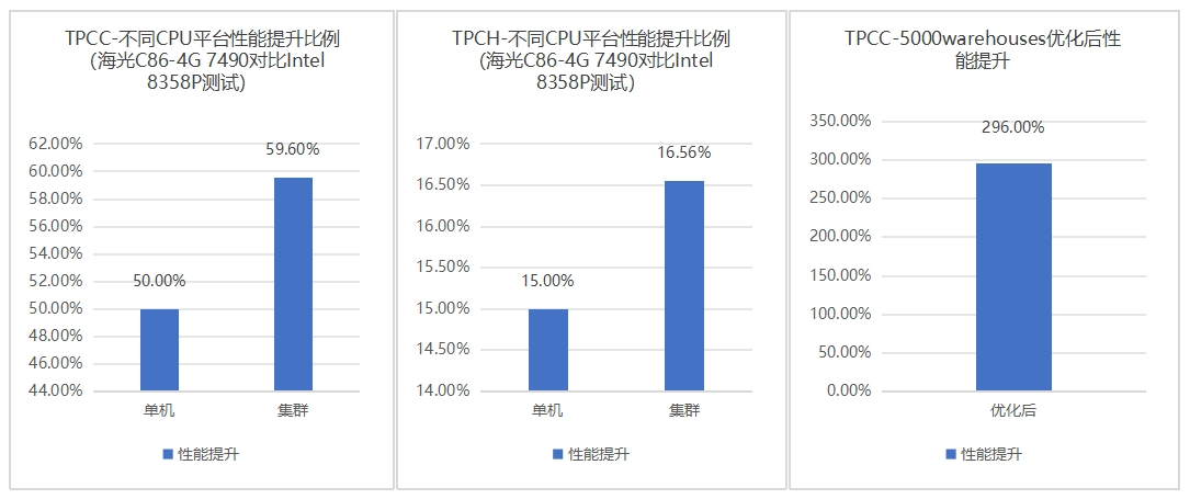 基于数据库分布式集群经过海光CPU亲和性优化、网络优化、存储过程优化及业务逻辑优化,通用标准场景性能C86-4G平台超Intel平台最高约60%,联合高性能版极限优化后数据库性能更是刷新了虚谷TPCC模型优化最高纪录,突破320万TPMC,应用性能提升296%。