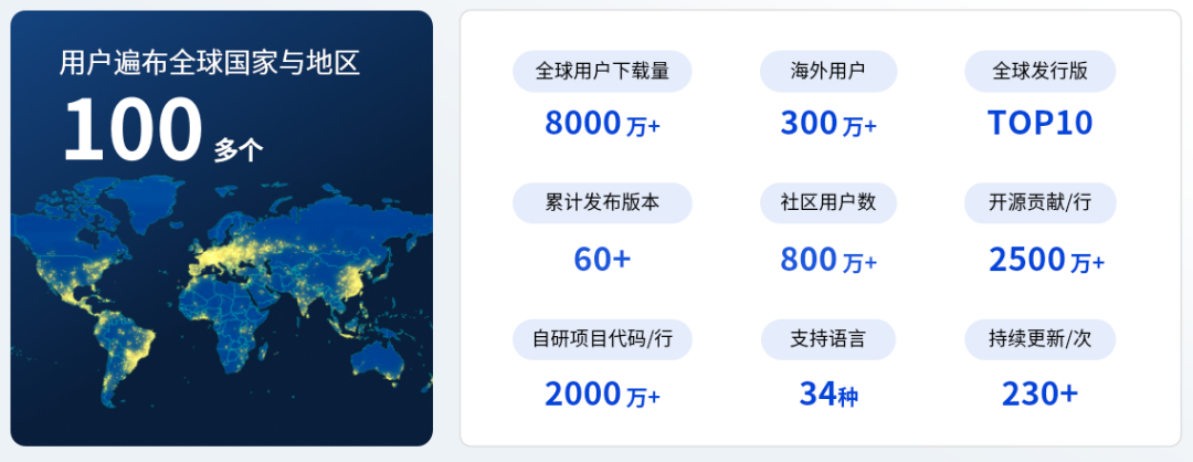 目前,deepin(深度)社区全球用户超 800 万,贡献开源代码超过 2500 万行;deepin(深度)操作系统累计下载量超 8000 万次,支持语言 34 种,位列 DistroWatch 网站的 Linux 排行榜 Top 10,在国际上拥有较大影响力。