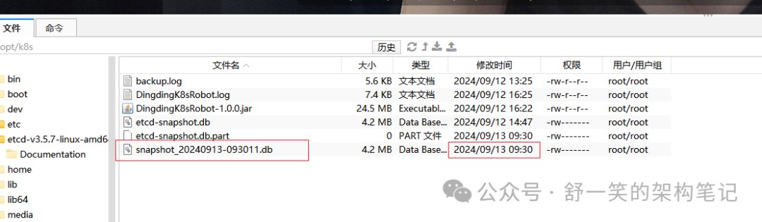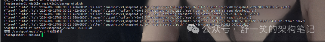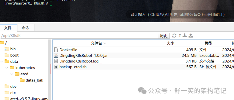 #!/bin/bash#时间戳,用来区分不同备份timestamp=`date +%Y%m%d-%H%M%S`#备份到哪个文件夹back_dir="/opt/k8s"#etcd集群列表endpoints="https://192.168.65.10:2379"#etcd证书路径cert_file="/etc/kubernetes/pki/etcd/server.crt"#etcd证书的key路径key_file="/etc/kubernetes/pki/etcd/server.key"#ca证书路径cacert_file="/etc/kubernetes/pki/etcd/ca.crt"mkdir -p $back_dirETCDCTL_API=3 etcdctl \--endpoints="${endpoints}" \--cert=$cert_file \--key=$key_file \--cacert=$cacert_file \snapshot save $back_dir/snapshot_$timestamp.db