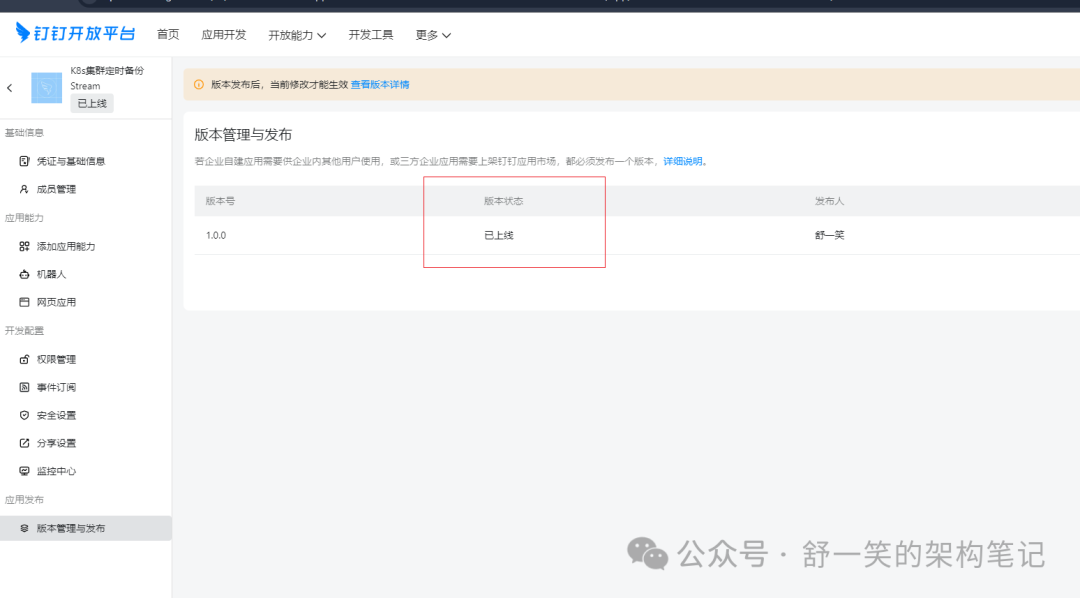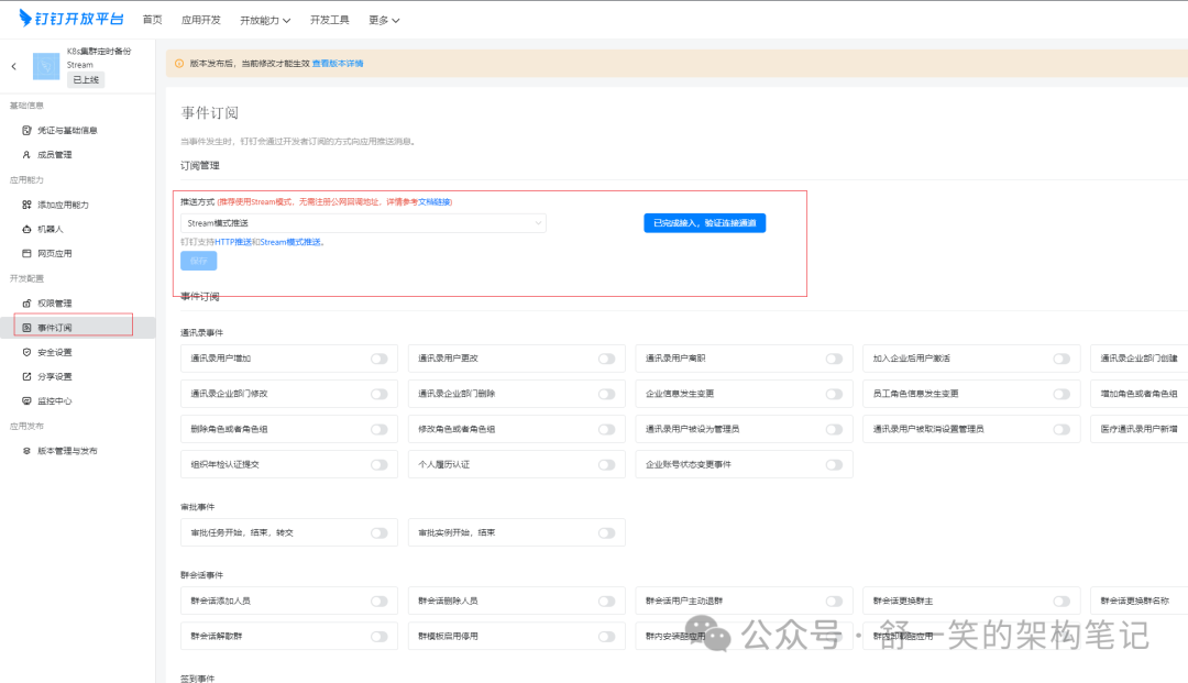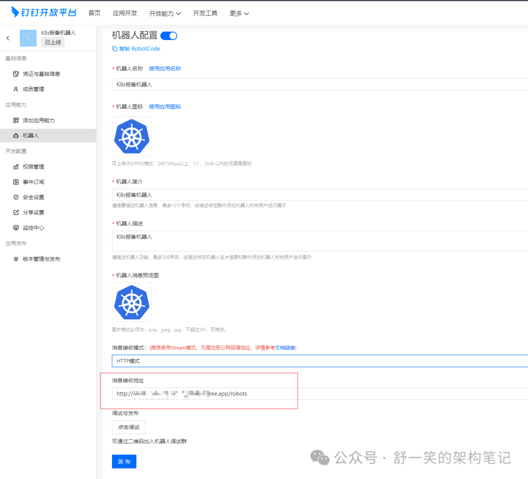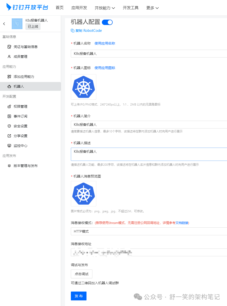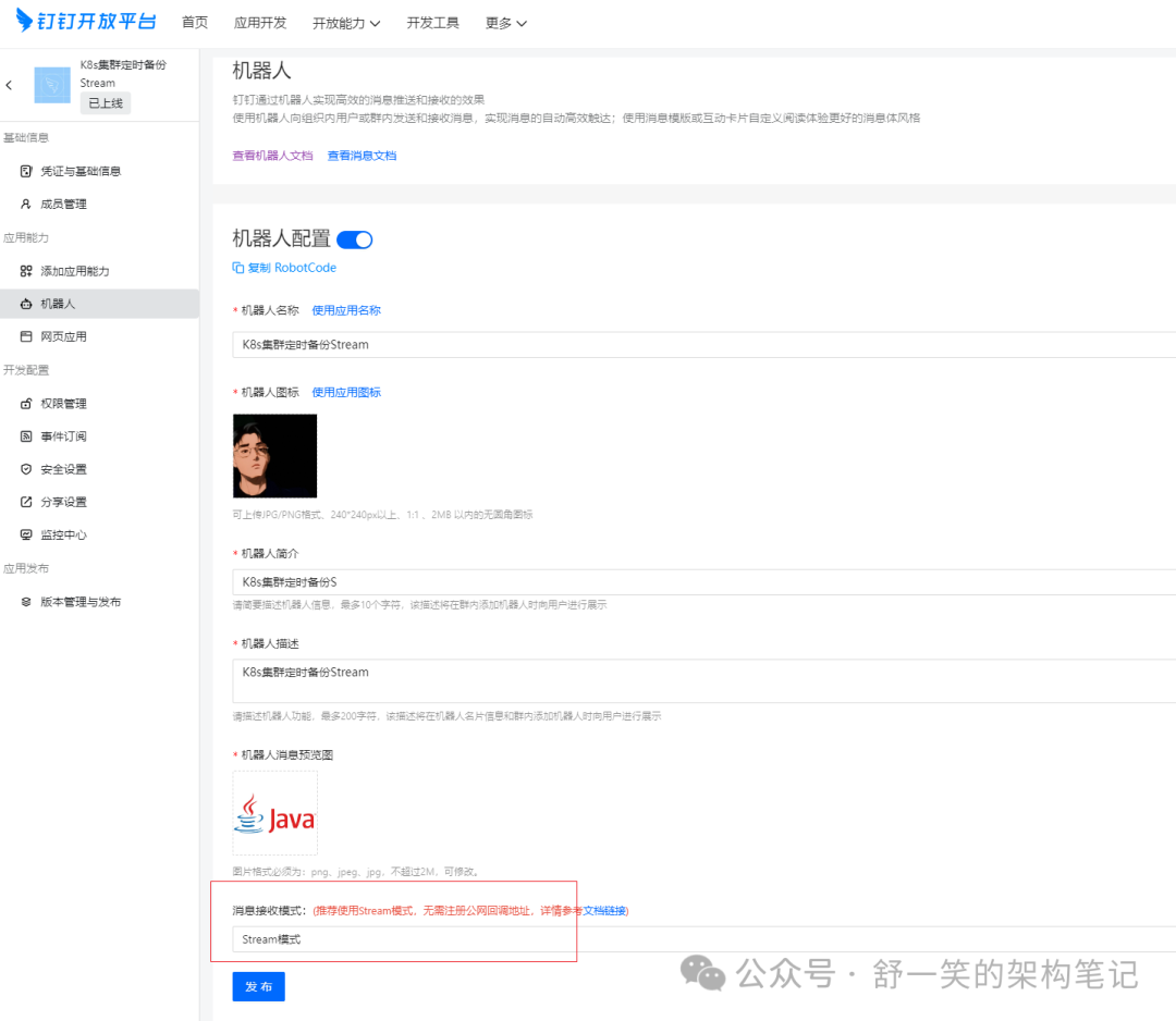 下面就是给大家演示一下这边这个机器人如何配置,没错这边就是需要使用到钉钉机器人的另一个Stream流方式,从我下面的名字定义应该也能看出来。