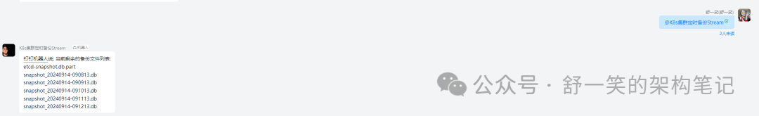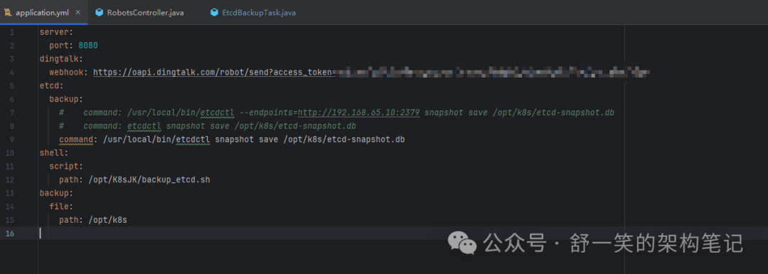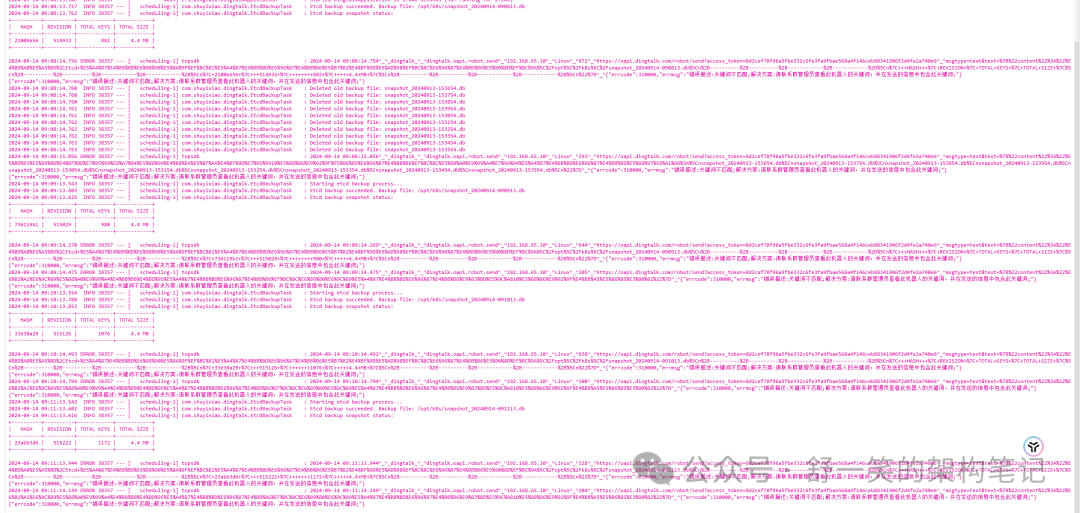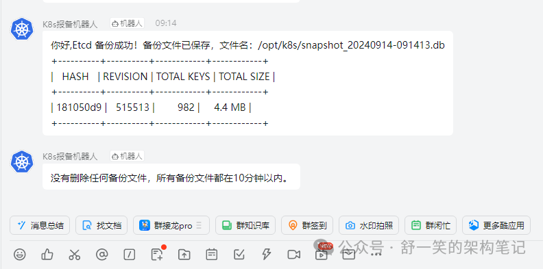 /*** Copyright © 2024年 integration-projects-maven. All rights reserved.* ClassName EtcdBackupTask.java* author 舒一笑 yixiaoshu88@163.com* version 1.0.0* Description etcd定时备份逻辑实现* createTime 2024年09月11日 15:41:00*/@Component@Slf4jpublic class EtcdBackupTask {@Value("${dingtalk.webhook}")private String dingTalkWebhook;@Value("${shell.script.path}")private String shellScriptPath;@Value("${backup.file.path}")private String backupFilePath;private final RobotsController robotsController;public EtcdBackupTask(RobotsController robotsController) {this.robotsController = robotsController;}@Scheduled(fixedRate = 60000) 每1分钟执行一次备份public void backupEtcd() {log.info("Starting etcd backup process...");try {使用 ProcessBuilder 调用 shell 脚本ProcessBuilder processBuilder = new ProcessBuilder("/bin/bash", shellScriptPath);processBuilder.environment().remove("ETCDCTL_CERT"); 移除可能存在的环境变量processBuilder.redirectErrorStream(true);Process process = processBuilder.start();捕获输出日志String backupLog = captureProcessOutput(process);等待进程完成,设置较长的超时时间,例如10分钟boolean finished = process.waitFor(10, TimeUnit.MINUTES);if (!finished) {如果进程未在规定时间内完成,强制终止并发送警告消息process.destroyForcibly();sendDingTalkMessage("你好,Etcd 备份失败!备份进程超时。");log.error("Etcd backup process timed out.");return;}int exitCode = process.exitValue();if (exitCode == 0) {// String backupFileName = getBackupFileName(backupLog);// log.info("Etcd backup succeeded. Backup file: " + backupFileName);// sendDingTalkMessage("你好,Etcd 备份成功!备份文件已保存,文件名:" + backupFileName);String backupFileName = getBackupFileName(backupLog);log.info("Etcd backup succeeded. Backup file: " + backupFileName);获取备份文件状态String snapshotStatus = getSnapshotStatus(backupFileName);log.info("Etcd backup snapshot status: \n" + snapshotStatus);将备份文件名和状态发送到钉钉sendDingTalkMessage("你好,Etcd 备份成功!备份文件已保存,文件名:" + backupFileName + "\n" + snapshotStatus);清理一周前的备份文件cleanOldBackups(backupFilePath);} else {log.error("Etcd backup failed with exit code: " + exitCode);log.error("Etcd backup failed. Error log: \n" + backupLog);sendDingTalkMessage("你好,Etcd 备份失败!错误信息:" + backupLog);}} catch (IOException e) {log.error("IOException occurred during etcd backup process.", e);sendDingTalkMessage("你好,Etcd 备份过程中发生IO异常:" + e.getMessage());} catch (InterruptedException e) {log.error("Backup process interrupted.", e);Thread.currentThread().interrupt(); 恢复中断状态sendDingTalkMessage("你好,Etcd 备份过程中发生中断:" + e.getMessage());} catch (Exception e) {log.error("An unexpected error occurred during etcd backup.", e);sendDingTalkMessage("你好,Etcd 备份过程中发生异常:" + e.getMessage());}}捕获命令的输出和错误流private String captureProcessOutput(Process process) throws IOException {BufferedReader errorStream = new BufferedReader(new InputStreamReader(process.getErrorStream()));BufferedReader outputStream = new BufferedReader(new InputStreamReader(process.getInputStream()));StringBuilder logBuilder = new StringBuilder();String line;捕获错误输出while ((line = errorStream.readLine()) != null) {logBuilder.append("ERROR: ").append(line).append("\n");}捕获标准输出while ((line = outputStream.readLine()) != null) {logBuilder.append("OUTPUT: ").append(line).append("\n");}return logBuilder.toString();}private void sendDingTalkMessage(String message) {robotsController.sendMessage(dingTalkWebhook, message);}从日志中提取备份文件名的逻辑,假设日志里有明确的文件路径private String getBackupFileName(String backupLog) {使用正则表达式提取 "Snapshot saved at" 后的文件路径String regex = "Snapshot saved at (.+\\.db)"; 匹配最终保存的 ".db" 文件路径Pattern pattern = Pattern.compile(regex);Matcher matcher = pattern.matcher(backupLog);if (matcher.find()) {return matcher.group(1).trim(); 返回捕获的文件路径}return "unknown"; 如果未找到则返回 unknown}获取快照状态的方法private String getSnapshotStatus(String backupFileName) throws IOException, InterruptedException {执行 `etcdctl snapshot status` 命令ProcessBuilder processBuilder = new ProcessBuilder("etcdctl", "--write-out=table", "snapshot", "status", backupFileName);Process process = processBuilder.start();String snapshotStatus = captureProcessOutput(process);process.waitFor(1, TimeUnit.MINUTES);清理掉 "OUTPUT:" 前缀,但保留行内容StringBuilder cleanedOutput = new StringBuilder();String[] lines = snapshotStatus.split("\n");for (String line : lines) {// 移除 "OUTPUT:" 前缀,但保留行的内容if (line.startsWith("OUTPUT:")) {cleanedOutput.append(line.replace("OUTPUT: ", "")).append("\n");} else if (!line.contains("ERROR") && !line.contains("Deprecated")) {cleanedOutput.append(line).append("\n");}}return cleanedOutput.toString();}// public void cleanOldBackups(String backupDirectory) throws IOException {// try (Stream<Path> files = Files.list(Paths.get(backupDirectory))) {// files.forEach(file -> {// try {// BasicFileAttributes attr = Files.readAttributes(file, BasicFileAttributes.class);// LocalDateTime fileTime = LocalDateTime.ofInstant(attr.lastModifiedTime().toInstant(), ZoneId.systemDefault());//// // 检查文件是否超过7天// if (fileTime.isBefore(LocalDateTime.now().minusDays(7))) {// Files.delete(file);// log.info("Deleted old backup file: " + file.getFileName());// }// } catch (IOException e) {// log.error("Error while deleting old backup file: " + file.getFileName(), e);// }// });// }// }public void cleanOldBackups(String backupDirectory) throws IOException {// 存储删除的文件名StringBuilder deletedFiles = new StringBuilder("当前保留规则为只保留10分钟内文件,删除的备
