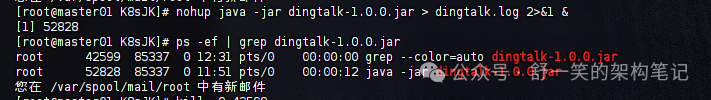 nohup java -jar dingtalk-1.0.0.jar > dingtalk.log 2>&1 &