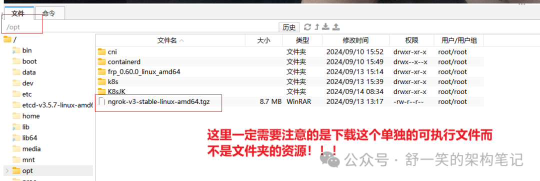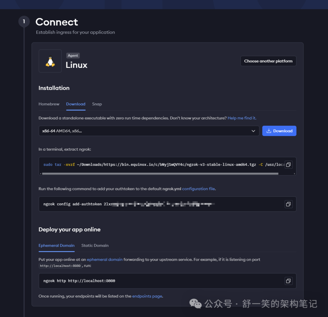 这块只需要根据官网下面的指示进行操作就可以。「但是介绍一个下载这边取巧的技巧就是可以通过科学的手段进行将ngrok下载下来之后将下面的命令修改一下执行」,我这边是已经把这个ngrok下载之后放在了opt目录下才这么写~