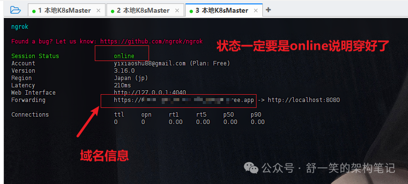 执行内网穿透命令,这边执行8080是因为服务的端口我设置的也是8080,两者需要匹配上。