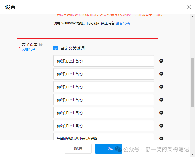 完成上述配置之后需要在钉钉客户端中也一样配置机器人的信息,还有就是自己个性化的回复语不然会有报错