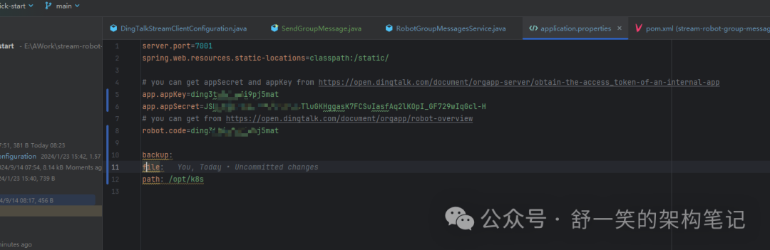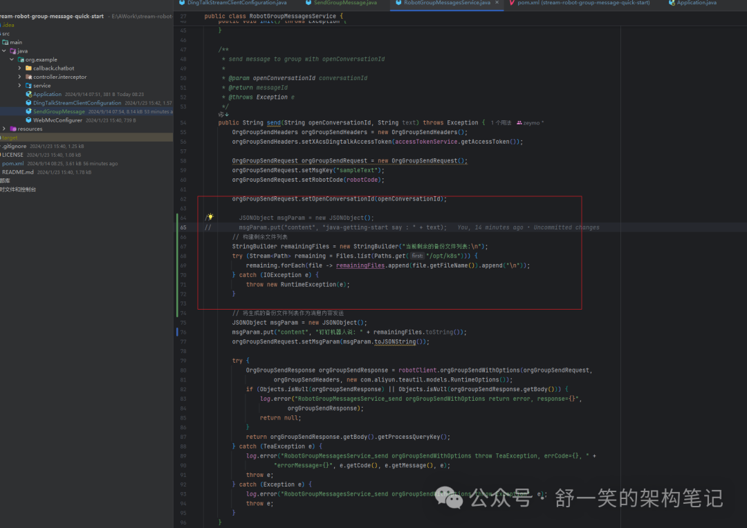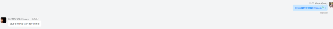 @RestController@Slf4j/*** 实现了机器人的简单问答功能*/public class RobotsController {private static final String Hello = "你好";@Autowiredprivate RobotsController robotsController;@Value("${dingtalk.webhook}")private String dingTalkWebhook;@Value("${backup.file.path}")private String backupFilePath;@RequestMapping(value = "/robots", method = RequestMethod.POST)public String helloRobots(@RequestBody(required = false) JSONObject json) throws ApiException {System.out.println(json);String content = json.getJSONObject("text").get("content").toString().replaceAll(" ", "");// 获取用户手机号,用于发送@消息// String mobile = getUserMobile(json.getString("senderStaffId"));String sessionWebhook = json.getString("sessionWebhook");DingTalkClient client = new DefaultDingTalkClient(sessionWebhook);if (content.contains(Hello)) {hello(client,backupFilePath);} else {learning(client);}return null;}/*** 发送钉钉通知消息*/public void sendMessage(String webhookUrl, String messageContent) {DingTalkClient client = new DefaultDingTalkClient(webhookUrl);try {OapiRobotSendRequest request = new OapiRobotSendRequest();request.setMsgtype("text");OapiRobotSendRequest.Text text = new OapiRobotSendRequest.Text();text.setContent(messageContent);request.setText(text);OapiRobotSendResponse response = client.execute(request);System.out.println(response.getBody());} catch (ApiException e) {e.printStackTrace();}}/*** 回答其他*/private void learning(DingTalkClient client) {try {OapiRobotSendRequest request = new OapiRobotSendRequest();request.setMsgtype("text");OapiRobotSendRequest.Text text = new OapiRobotSendRequest.Text();text.setContent("我是问好机器人 ~");request.setText(text);// OapiRobotSendRequest.At at = new OapiRobotSendRequest.At();// at.setAtMobiles(Arrays.asList(mobile));// isAtAll类型如果不为Boolean,请升级至最新SDK// at.setIsAtAll(false);// request.setAt(at);OapiRobotSendResponse response = client.execute(request);System.out.println(response.getBody());} catch (ApiException e) {e.printStackTrace();}}/*** 回答你好*/public void hello(DingTalkClient client,String backupDirectory) throws ApiException {OapiRobotSendRequest request = new OapiRobotSendRequest();request.setMsgtype("text");OapiRobotSendRequest.Text text = new OapiRobotSendRequest.Text();text.setContent("哈哈,稍等马上给你当前备份的剩余文件信息~");request.setText(text);// // OapiRobotSendRequest.At at = new OapiRobotSendRequest.At();// // at.setAtMobiles(Arrays.asList(mobile));// // isAtAll类型如果不为Boolean,请升级至最新SDK// // at.setIsAtAll(false);// // request.setAt(at);OapiRobotSendResponse response = client.execute(request);System.out.println(response.getBody());// 构建剩余文件列表StringBuilder remainingFiles = new StringBuilder("当前剩余的备份文件列表:\n");try (Stream<Path> remaining = Files.list(Paths.get(backupDirectory))) {remaining.forEach(file -> remainingFiles.append(file.getFileName()).append("\n"));sendDingTalkMessage(remainingFiles.toString());} catch (IOException e) {throw new RuntimeException(e);}}private void sendDingTalkMessage(String message) {robotsController.sendMessage(dingTalkWebhook, message);}}