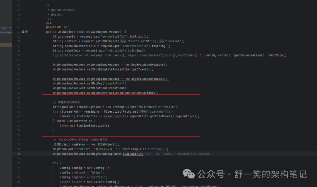 @Overridepublic JSONObject execute(JSONObject request) {String userId = request.get("senderStaffId").toString();String content = request.getJSONObject("text").getString("content");String openConversationId = request.get("conversationId").toString();String robotCode = request.get("robotCode").toString();log.info("receive bot message from user={}, msg={},openConversationId={},robotCode={} ", userId, content, openConversationId, robotCode);OrgGroupSendHeaders orgGroupSendHeaders = new OrgGroupSendHeaders();orgGroupSendHeaders.setXAcsDingtalkAccessToken(getToken());OrgGroupSendRequest orgGroupSendRequest = new OrgGroupSendRequest();orgGroupSendRequest.setMsgKey("sampleText");orgGroupSendRequest.setRobotCode(robotCode);orgGroupSendRequest.setOpenConversationId(openConversationId);// 构建剩余文件列表StringBuilder remainingFiles = new StringBuilder("当前剩余的备份文件列表:\n");try (Stream<Path> remaining = Files.list(Paths.get("/opt/k8s"))) {remaining.forEach(file -> remainingFiles.append(file.getFileName()).append("\n"));} catch (IOException e) {throw new RuntimeException(e);}// 将生成的备份文件列表作为消息内容发送JSONObject msgParam = new JSONObject();msgParam.put("content", "钉钉机器人说: " + remainingFiles.toString());orgGroupSendRequest.setMsgParam(msgParam.toJSONString());try {Config config = new Config();config.protocol = "https";config.regionId = "central";Client client = new Client(config);OrgGroupSendResponse orgGroupSendResponse = client.orgGroupSendWithOptions(orgGroupSendRequest,orgGroupSendHeaders, new com.aliyun.teautil.models.RuntimeOptions());if (Objects.isNull(orgGroupSendResponse) || Objects.isNull(orgGroupSendResponse.getBody())) {log.error("RobotGroupMessagesService_send orgGroupSendWithOptions return error, response={}", orgGroupSendResponse);return null;}return new JSONObject();} catch (TeaException e) {log.error("RobotGroupMessagesService_send orgGroupSendWithOptions throw TeaException, errCode={}, errorMessage={}", e.getCode(), e.getMessage(), e);throw e;} catch (Exception e) {log.error("RobotGroupMessagesService_send orgGroupSendWithOptions throw Exception", e);throw new RuntimeException(e);}}