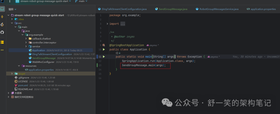 <?xml version="1.0" encoding="UTF-8"?><project xmlns="http://maven.apache.org/POM/4.0.0"xmlns:xsi="http://www.w3.org/2001/XMLSchema-instance"xsi:schemaLocation="http://maven.apache.org/POM/4.0.0 http://maven.apache.org/xsd/maven-4.0.0.xsd"><modelVersion>4.0.0</modelVersion><parent><groupId>org.springframework.boot</groupId><artifactId>spring-boot-starter-parent</artifactId><version>2.4.2</version><relativePath/></parent><groupId>com.dingtalk</groupId><artifactId>stream-robot-group-message-quick-start</artifactId><version>1.0-SNAPSHOT</version><packaging>jar</packaging><properties><maven.compiler.source>8</maven.compiler.source><maven.compiler.target>8</maven.compiler.target></properties><dependencies><dependency><groupId>com.dingtalk.open</groupId><artifactId>dingtalk-stream</artifactId><version>1.1.0</version></dependency><dependency><groupId>org.springframework.boot</groupId><artifactId>spring-boot-starter-web</artifactId></dependency><dependency><groupId>org.slf4j</groupId><artifactId>slf4j-api</artifactId><version>1.7.7</version></dependency><dependency><groupId>org.projectlombok</groupId><artifactId>lombok</artifactId><version>1.18.26</version><optional>true</optional></dependency><dependency><groupId>com.aliyun</groupId><artifactId>dingtalk</artifactId><version>1.5.59</version></dependency><dependency><groupId>org.asynchttpclient</groupId><artifactId>async-http-client</artifactId><version>2.12.3</version><exclusions><exclusion><groupId>io.netty</groupId><artifactId>netty-common</artifactId></exclusion><exclusion><groupId>io.netty</groupId><artifactId>netty-resolver</artifactId></exclusion></exclusions></dependency><dependency><groupId>org.apache.httpcomponents</groupId><artifactId>httpclient</artifactId><version>4.5.12</version></dependency><dependency><groupId>org.apache.httpcomponents</groupId><artifactId>httpmime</artifactId><version>4.5.12</version></dependency><dependency><groupId>org.apache.httpcomponents</groupId><artifactId>httpcore</artifactId><version>4.4.13</version></dependency><dependency><groupId>com.aliyun</groupId><artifactId>alibaba-dingtalk-service-sdk</artifactId><version>2.0.0</version></dependency><dependency><groupId>com.alibaba</groupId><artifactId>fastjson</artifactId><version>1.2.68</version></dependency></dependencies><build><plugins><plugin><groupId>org.springframework.boot</groupId><artifactId>spring-boot-maven-plugin</artifactId><configuration><mainClass>org.example.Application</mainClass></configuration></plugin></plugins></build></project>