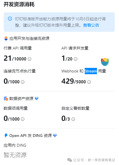 好了本次的介绍到这里就结束了,需要注意的是上述的解决方案可以解决没有ssl认证但又可以与机器人交流的功能效果,但是需要注意的是由于上述的两个机器人分别使用了Webhook和Stream两种。这两种钉钉官方是存在调用的限制的,如果是长期需要频繁稳定的使用需要开通钉钉的会员。不然额度这块不是很够。