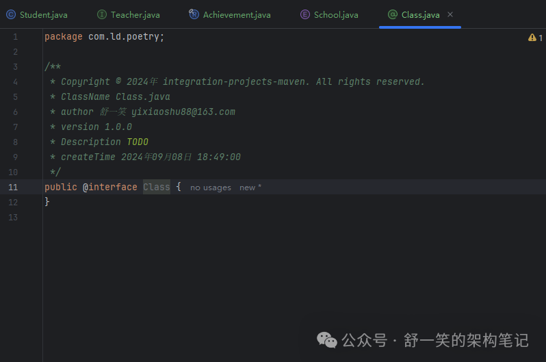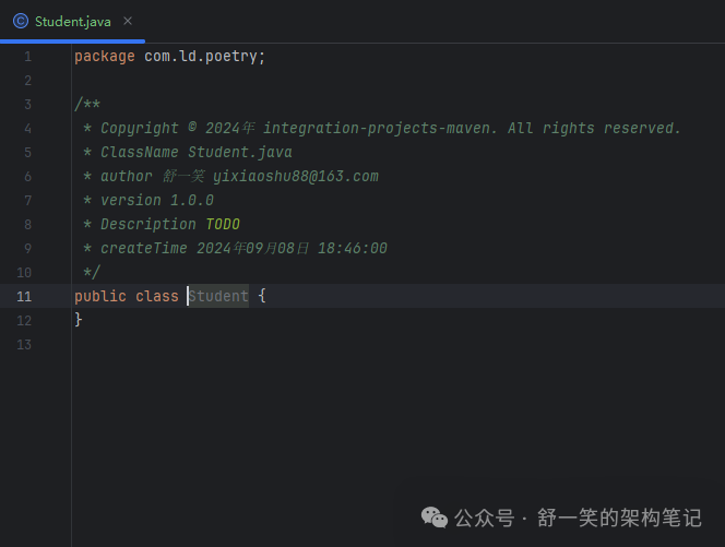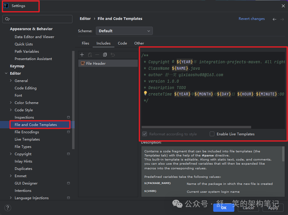 新增支持在设置的编辑器中,文件和代码模板设置里面配置类的文件信息。配置好之后就可以在新建的文件中得到配置的信息。