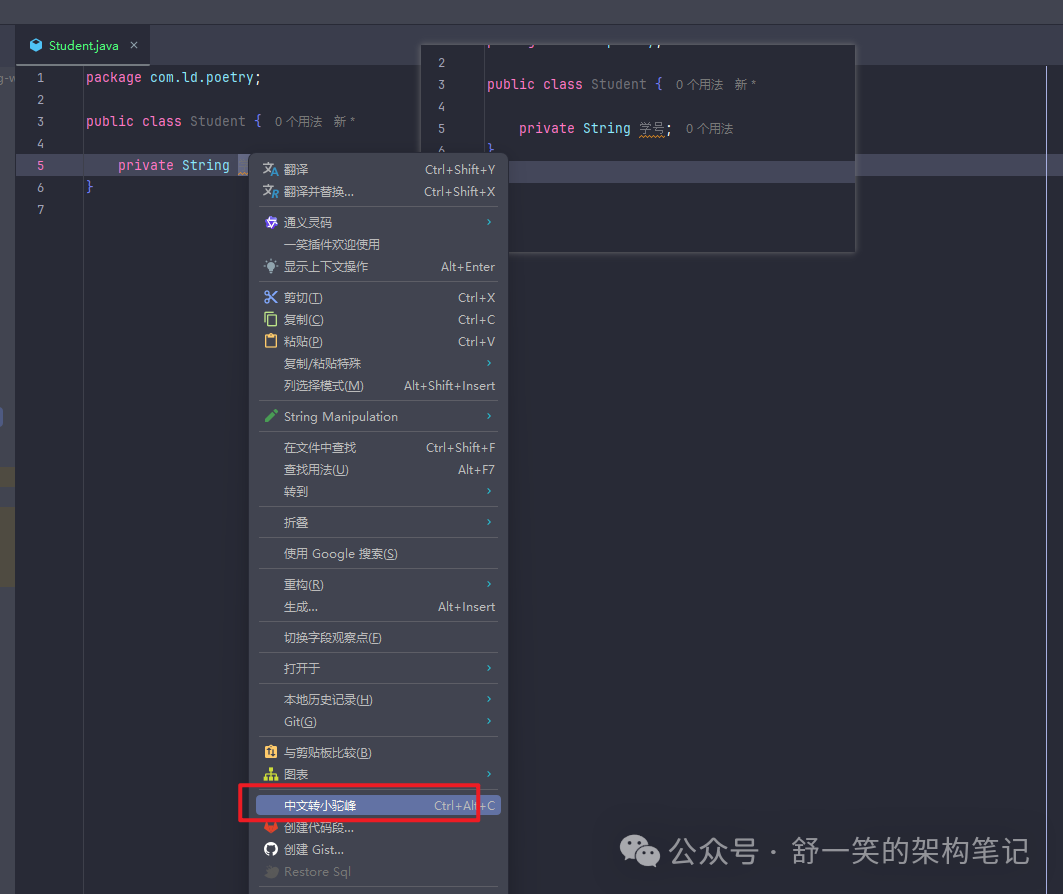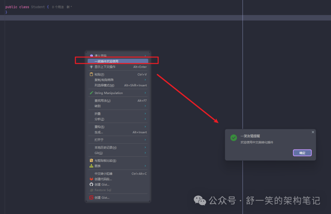 如何在日常的IDEA中实现创建一个中文类,能自动变成是规范的英文名称。 一笑插件给你解决