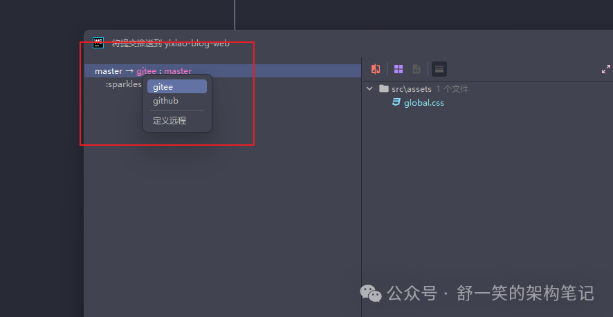 这里描述一下本地推送的场景,首先我在码云上建立了一个前端项目,进行了自己的个性化开发,后期在github上创建了一个一样的项目仓库存放代码。使用webstorm进行代码开发。在下面这个位置可以选择推送的代码位置。