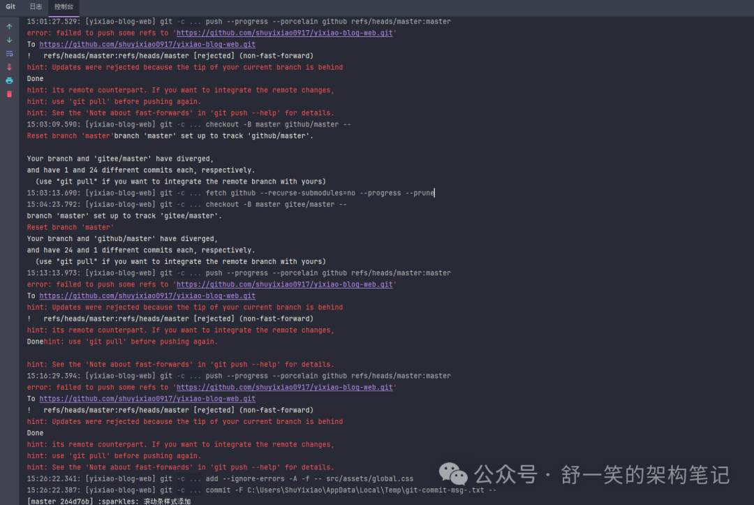 选择推送github仓库之后,仓库文件和本地的文件不一致,我本地开发的文件实在码云的仓库代码之下,所以推送出现了下面截图的报错: