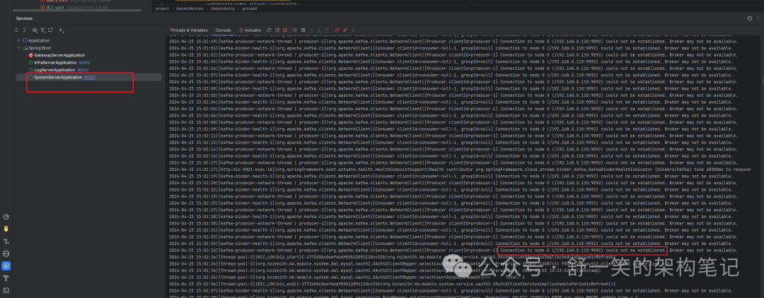 从下面的信息可以查出kafka服务果然挂掉了,下面的信息还是只出现了Zookeeper服务的详细日志信息
