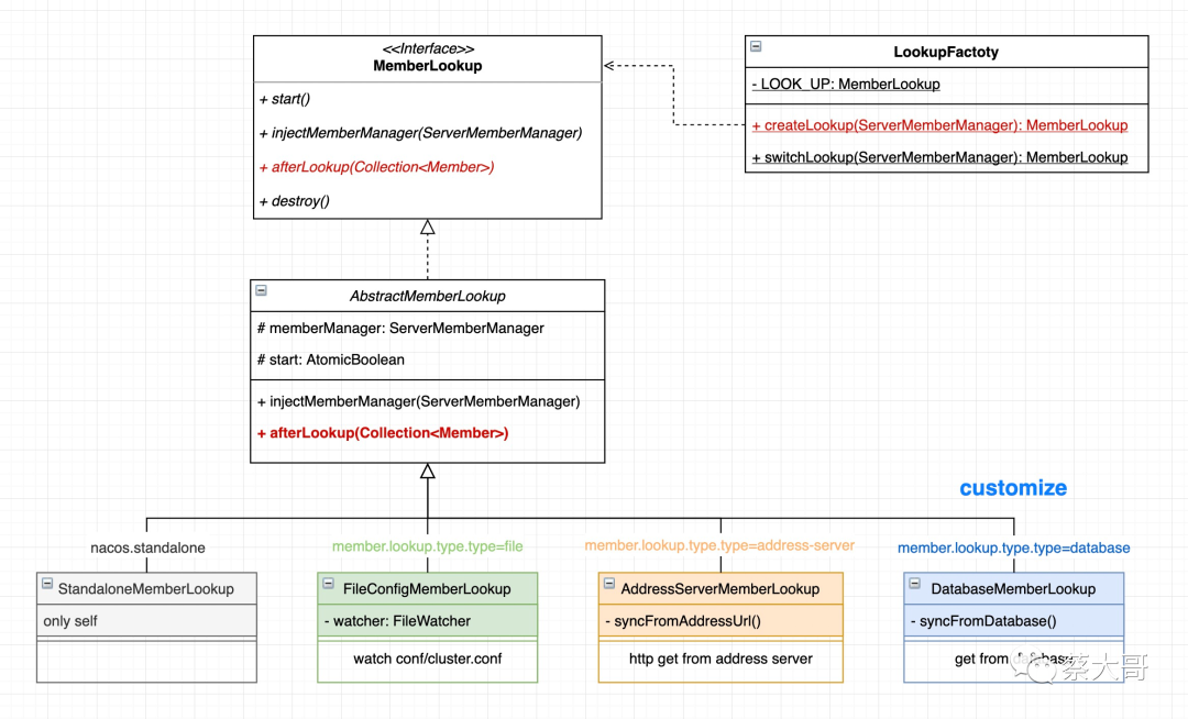 Nacos 在启动时创建 ServerMemberManager(核心的集群成员操作类),它会调用 LookupFactory.createLookup() 通过 nacos.core.member.lookup.type 指定的类别初始化 MemberLookup 实现类;后续的成员发现和变更由 MemberLookup.afterLookup() 通知到 ServerMemberManager,此后"配置管理模块"、"注册中心模块"所感知的集群成员都由 ServerMemberManager 取得。