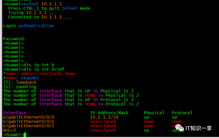 interface GigabitEthernet0/0/0 # 配置接口地址ip address 10.1.1.1 255.255.255.0user-interface vty 0 4 # 创建远程虚拟接口authentication-mode password #认证模式为密码认证,一般情况下都采用aaa模式下的认证,较为安全user privilege level 15 # 设置用户等级set authentication password cipher huawei #创建加密密码