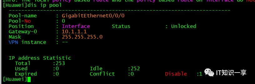 [Huawei]dhcp enable # 使能DHCP服务# 配置IP地址,[Huawei-GigabitEthernet0/0/0]ip address 10.1.1.1 24# 用来关联接口和接口地址池,为连接到接口的主机提供配置信息。[Huawei-GigabitEthernet0/0/0]dhcp select interface# 接口地址池下的DNS服务器地址[Huawei-GigabitEthernet0/0/0]dhcp server dns-list 10.1.1.2# 排除地址[Huawei-GigabitEthernet0/0/0]dhcp server excluded-ip-address 10.1.1.2# 设置IP地址租用有效期为3天[Huawei-GigabitEthernet0/0/0]dhcp server lease day 3