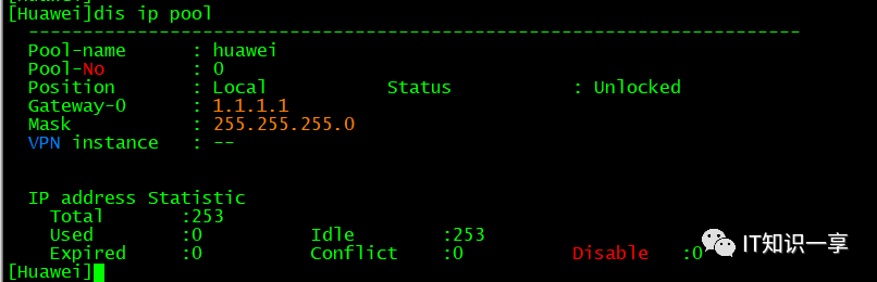 [Huawei]dhcp enable # 使能DHCP服务# 配置IP地址,[Huawei-GigabitEthernet0/0/0]ip address 10.1.1.1 24[Huawei]ip pool huawei # 创建全局地址池[Huawei-ip-pool-huawei]network 1.1.1.0 mask 24 # 创建地址池网络地址和掩码[Huawei-ip-pool-huawei]gateway-list 1.1.1.1 # 创建网关[Huawei-ip-pool-huawei]lease day 10 #租期有效期为10天[Huawei]int GigabitEthernet 0/0/0[Huawei-GigabitEthernet0/0/0]dhcp select global #应用全局地址池