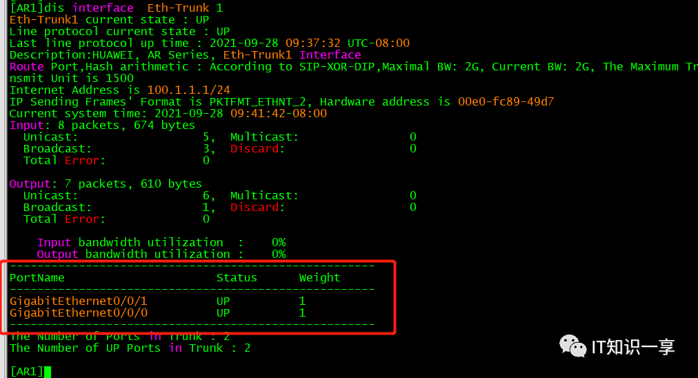 [AR1]int Eth-Trunk 1 # 创建链路聚合组[AR1-Eth-Trunk1]undo portswitch # 二层口转三层口[AR1-Eth-Trunk1]ip address 100.1.1.1 24 # 配置IP地址# 将接口加入链路聚合组[AR1]int GigabitEthernet 0/0/1[AR1-GigabitEthernet0/0/1]eth-trunk 1[AR1-GigabitEthernet0/0/1]qu[AR1]int GigabitEthernet 0/0/0[AR1-GigabitEthernet0/0/0]eth-trunk 1